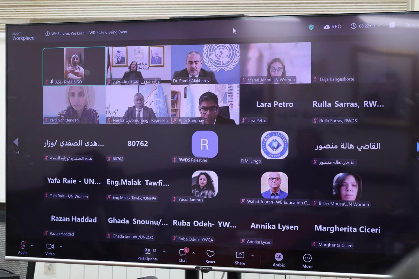 شاركت وزارة شؤون المرأة أ. منى الخليلي في الحدث الختامي لحملة اليوم العالمي للمرأة 2026 “ننجو_فنقود”، والذي نظمته هيئة الأمم المتحدة للمرأة بالشراكة مع صندوق الأمم المتحدة للسكان ومفوضية الأمم المتحدة السامية لحقوق الإنسان، وبدعم من مكتب ممثلية فنلندا، وذلك بمشاركة واسعة من المؤسسات الرسمية والأممية، ومؤسسات المجتمع المدني، وممثلات عن المؤسسات النسوية. ويأتي هذا الحدث تتويجاً لحملة اليوم العالمي للمرأة تحت شعار “ننجو ونقود”، والتي سلطت الضوء على صمود النساء الفلسطينيات ودورهن القيادي وتأثيرهن في مجتمعاتهن.